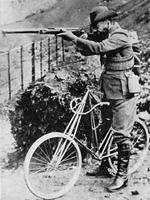 "For the sake og lightness and portability the experimental machine was built with a low frame and 24 ins. wheels, the seat being fixed farther back than usual. By a very simple device the frame can be disconnected (from the front fork) at the head in a few seconds for the purpose of carriage. Instead of attaching the rifle rigidly to the machine as is customary, it is carried in a vertical position in front on two light projecting arms which work against a spering, so that is a live instead of a dead weight. It can be detached in a moment and fired without dismounting, the lowness of the seat enabling the rider both feet on the ground. When the bicycle has to be carried it is disconnected and the front wheele with forks and, handlebar, secured by the side of the other by a single strap. And be carried on the bag of a soldier."